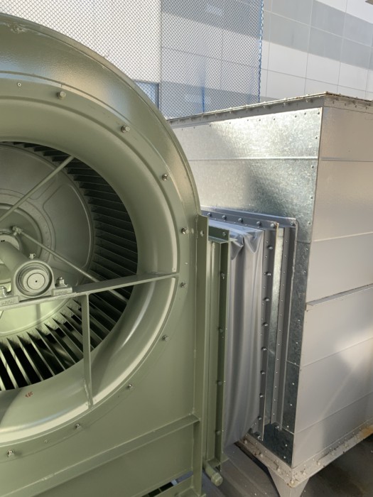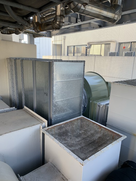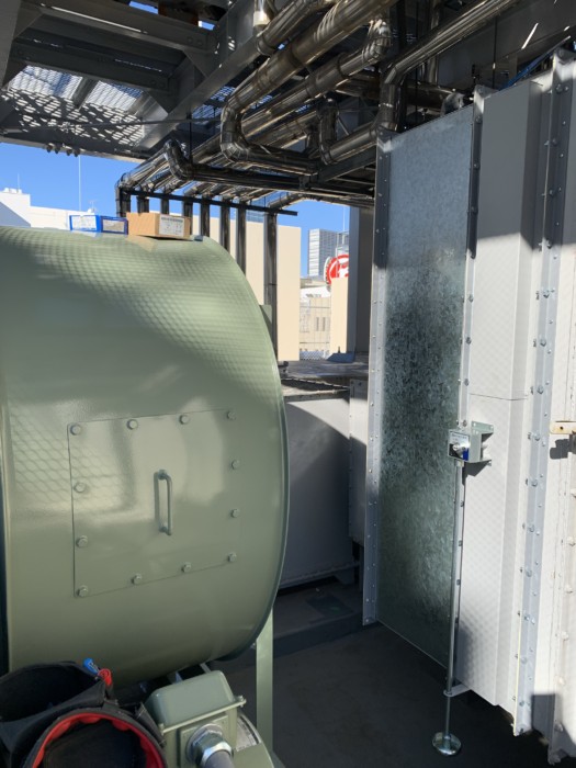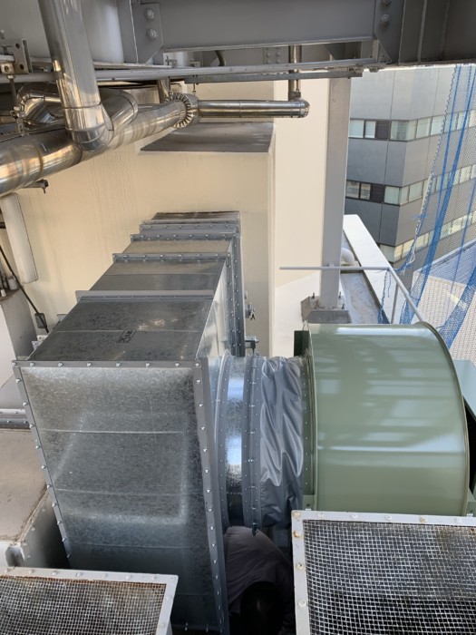 新宿某商業ビルの屋上で排気ファンの入れ替え及びダクト工事を行いました。